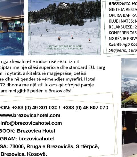 BREZOVICA HOTEL & SPA: I ndodhur në pjesën më të bukur në zemër të Brezovicës, mirë se vini në Brezovica Hotel & Spa. Larg nga zhurma dhe nxitimi i qytetit, hoteli është i vendosur në një pjesë magjepsëse dhe të qetë të rrethuar nga malet e Sharrit dhe përgjatë Lumit Lepenc. I ndërtuar me një arkitekturë të veçantë dhe magjepsëse, që të bën të ndjesh një qetësi shpirtërore, me një shërbim profesional që ruan standardet, e që në qendër të vëmendjes ka mysafirin, Hoteli posedon 72 dhoma të mobiluara me një stil luksoz modern, ku shumica e tyre ofrojnë pamje spektakolare mbi gjithë perlën e Brezovicës!