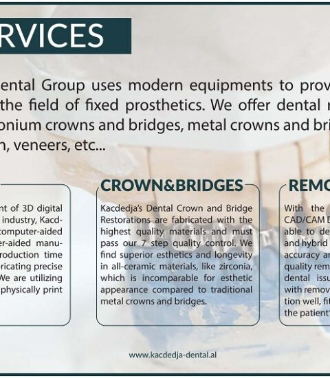KACDEDJA DENTAL GROUP: Përdorim aparatura moderne për ofrimin e shërbimeve të ndryshme në fushën e protetikës fikse. Ofrojmë restaurime dhëmbësh si kurora dhe ura zirkoni, kurora dhe ura metali, dizenjimin e abutmentave, krijimin e fasetave dentare (veneers) etj.