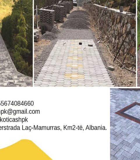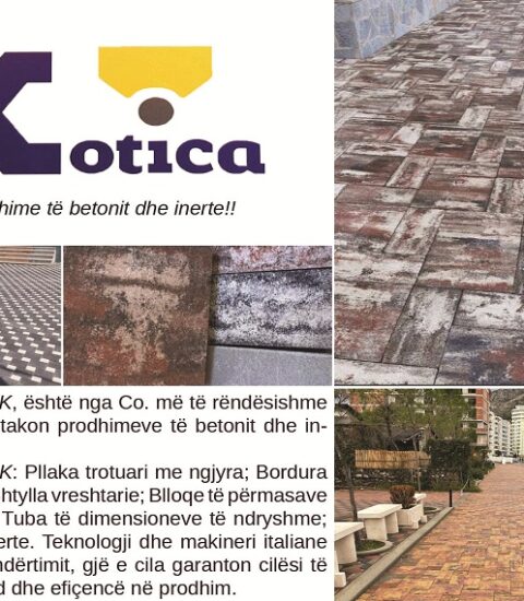 KOTICA SHPK: Pllaka trotuari me ngjyra; Bordura për trotuare; Shtylla vreshtarie; Blloqe të përmasave të ndryshme; Tuba të dimensioneve të ndryshme; Beton dhe Inerte.