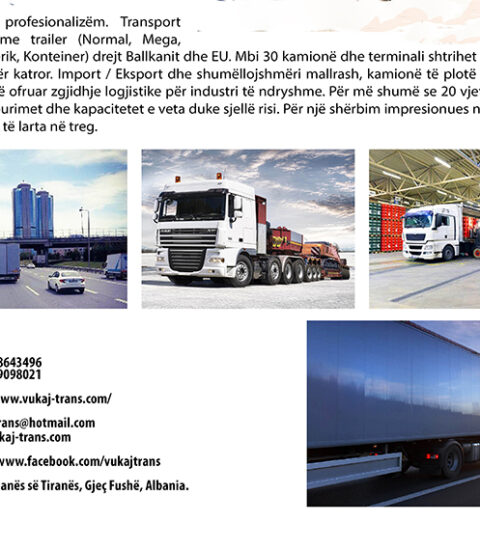VUKAJ TRANS SHPK: Kompania është e projektuar për të ofruar zgjidhje logjistike për industri të ndryshme. Për më shumë se 20 vjet, ka përmirësuar në vazhdimësi burimet dhe kapacitetet e veta duke sjellë risi. Përveçse profesionalizëm dhe siguri ofrojmë edhe çmime shumë të arsyeshme.